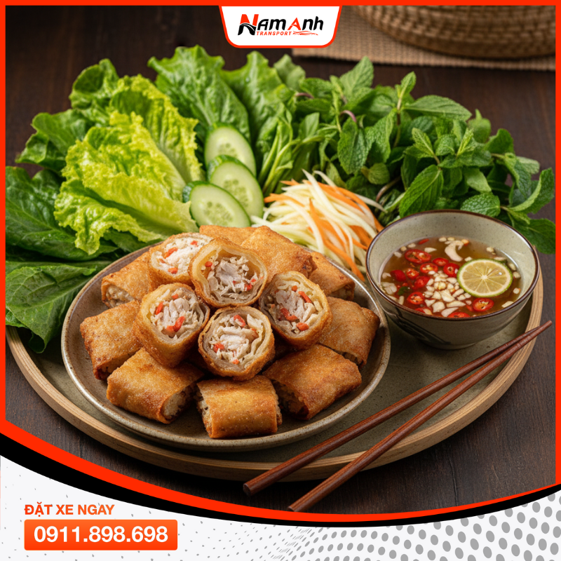 Khác nem miền khác, nem cua bể vuông vắn, nhân nhiều thịt cua – tôm – giá – mộc nhĩ, cuốn bánh đa nem mỏng, chiên vàng phồng. Chấm nước mắm chua ngọt, thêm rau sống – dưa góp là “bùng hương”. Ăn ngon vào buổi tối; gợi ý: khu Đinh Tiên Hoàng – Trần Nhật Duật.